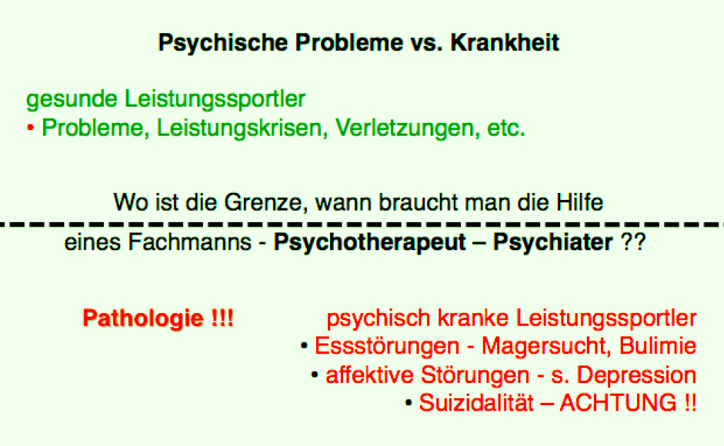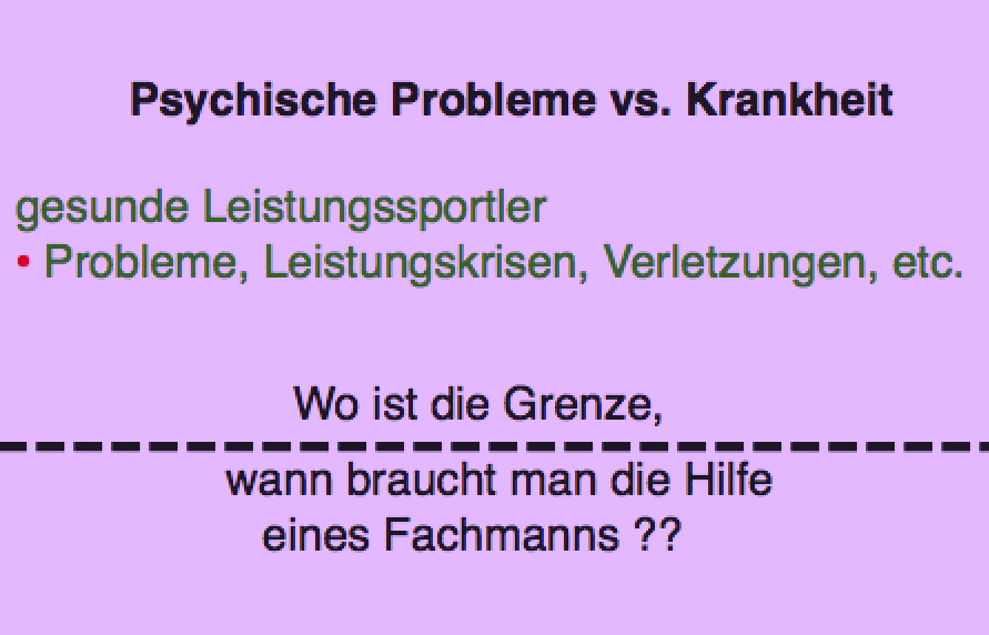 Leistungssportler gehören zu den Grenzgängern. Beim Verschieben der Grenzen können sie in Überbelastungen, Überforderungen oder Übertraining geraten. D.h. falls ein Hochleister unter den sportlichen Anforderungen leidet, ist Handeln angesagt !!